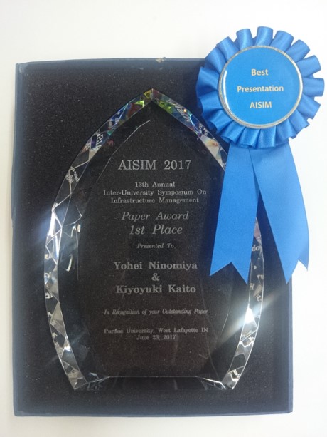 社会基盤マネジメント学領域の貝戸清之准教授と博士前期課程学生の二宮陽平君が、国際会議13th Annual Inter-University Symposium on Infrastructure Management (AISIM2017)(平成29年6月23日、米国Purdue Universityにおいて開催)にて、Paper Award (1st Place)を受賞しました。