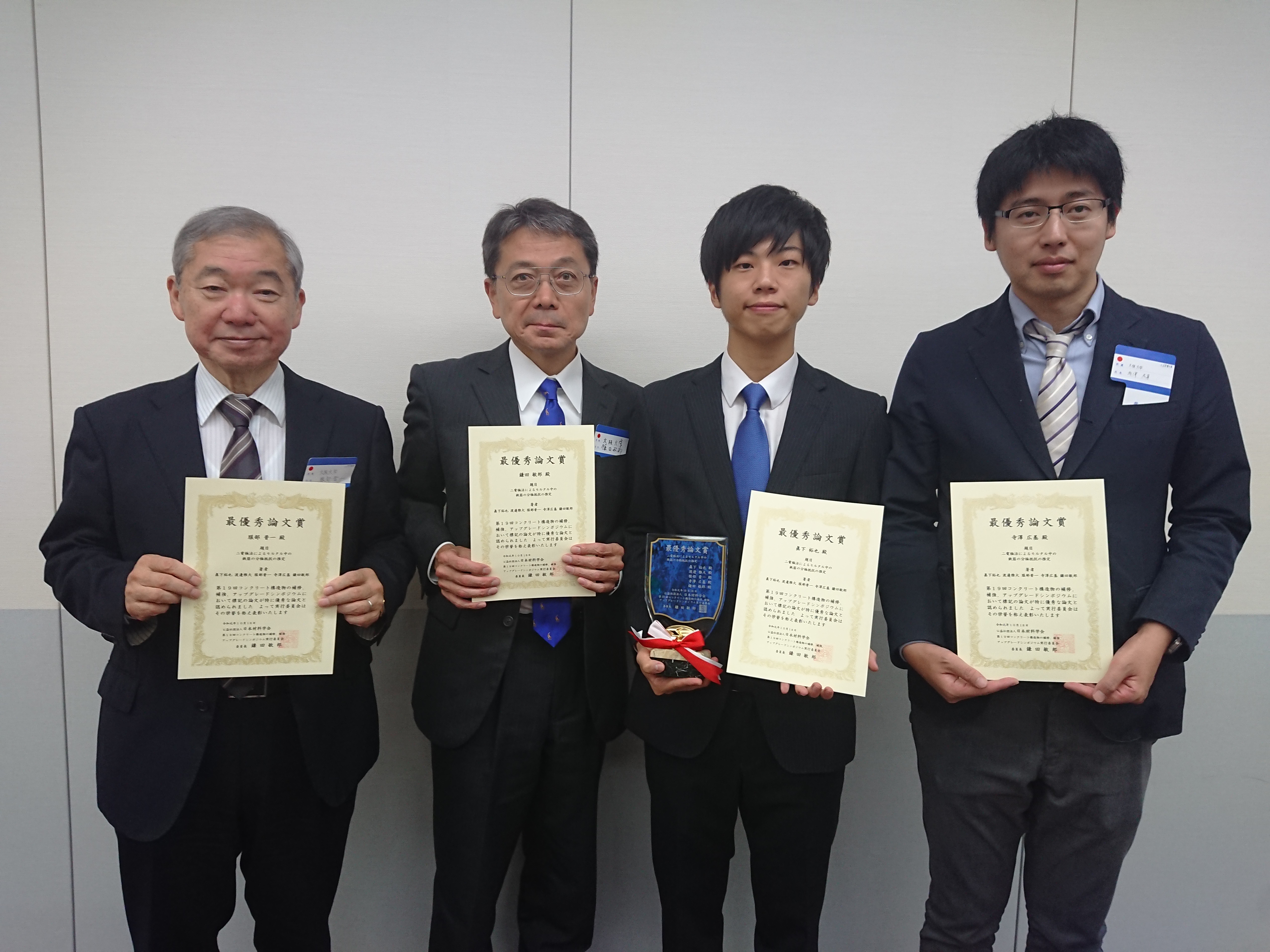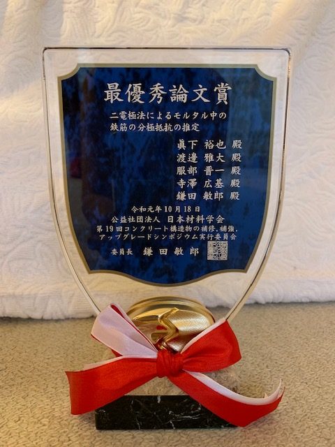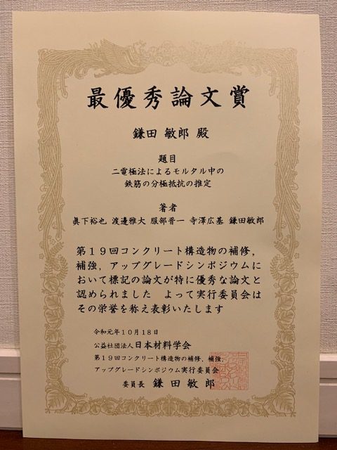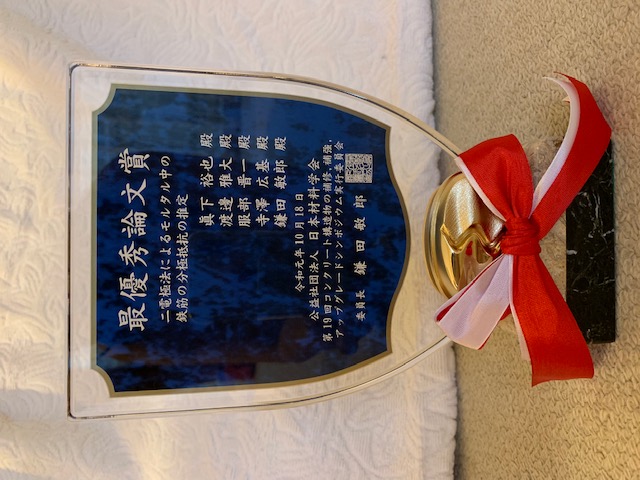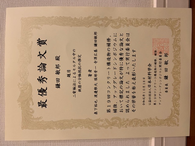 鎌田 敏郎教授、寺澤 広基助教、服部 晋一特任研究員らが「日本材料学会 第19回コンクリート構造物の補修、補強、アップグレードシンポジウム 最優秀論文賞」を受賞