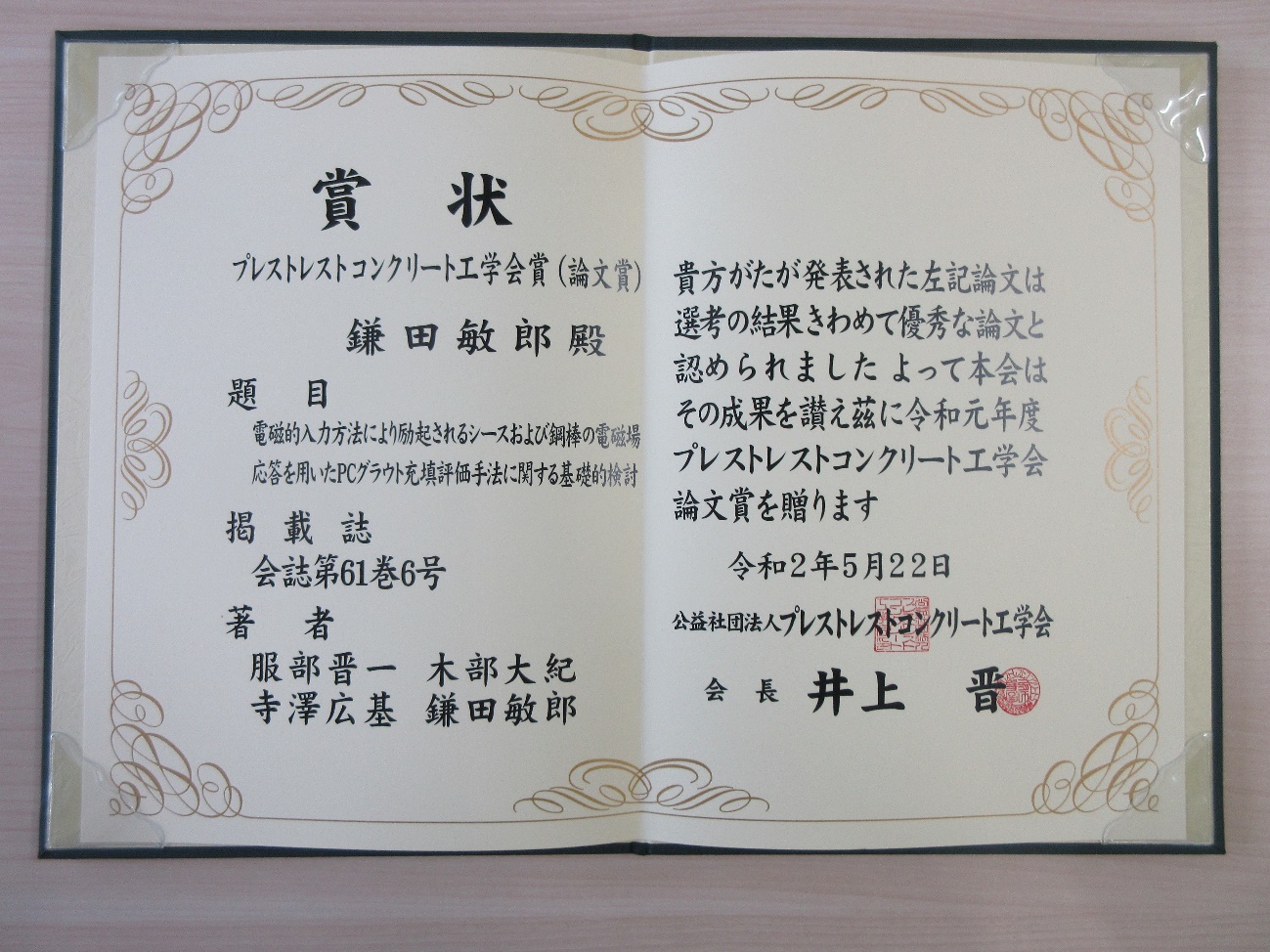 地球総合工学専攻の鎌田敏郎教授、寺澤広基助教、服部晋一特任助教、および卒業生の木部大紀さんが「令和元年度 プレストレストコンクリート工学会賞(論文賞)」を受賞しました。本賞は、プレストレストコンクリートに関する技術の進歩,発展に顕著な貢献をしたと認められる論文等を対象とし,平成30年から令和元年のプレストレストコンクリート工学会の各種刊行物に発表された論文,工事報告等から選ばれたものです。鎌田教授らは、論文「電磁的入力方法により励起されるシースおよび鋼棒の電磁場応答を用いたPCグラウト充填評価手法に関する基礎的検討」が高く評価され、本賞を受賞しました。