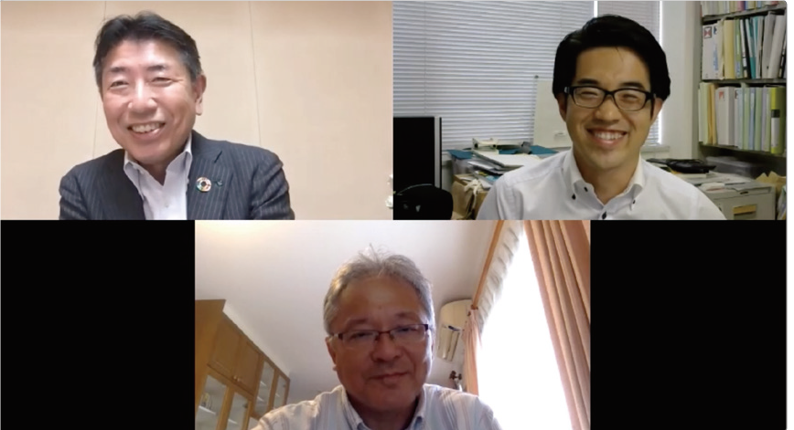 毎年秋学期開始直前には,1年生のクラス別懇談会として,大阪市内中之島付近で校外研修を行っていますが,今年はコロナウィルス感染拡大防止のため,実施できませんでした.そこで,本コースOBの株式会社大林組蓮輪賢冶社長(77年卒)にお時間を頂き,1年生向けのインタビューを実施し,オンラインセミナーの形に誂えました.ゼネコンと呼ばれる総合建設会社での土木や建築の仕事の内容,社会に対する役割,建設会社での働き方,事業のこれからの将来性について分かりやすくご説明頂き,総合建設会社について具体的なイメージを持てていなかった1年生には大変好評を得ました.(写真 左上:株式会社大林組 代表取締役 蓮輪賢冶 社長,下:青木教授,右上:入江准教授)