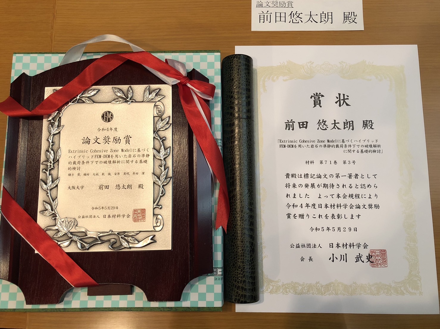 NEWS & TOPICS新着情報・お知らせ 一覧へ 2023-06-8 地盤工学 前田悠太朗君が「令和4年度日本材料学会論文奨励賞」を受賞 地盤工学領域の前田悠太朗君(博士後期課程1年)が「令和4年度日本材料学会論文奨励賞」を受賞しました。本賞は前2か年に学術雑誌「材料」に掲載された論文の第一著者で、学術・技術の進歩、発展に寄与し独創性と将来性に富む満40歳未満の個人に与えられるものです。前田君は、「Extrinsic Cohesive Zone Modelに基づくハイブリッドFEM-DEMを用いた岩石の準静的載荷条件下の破壊解析に関する基礎的検討」と題した論文が評価され、本賞を受賞しました。 前の記事へ 次の記事へ