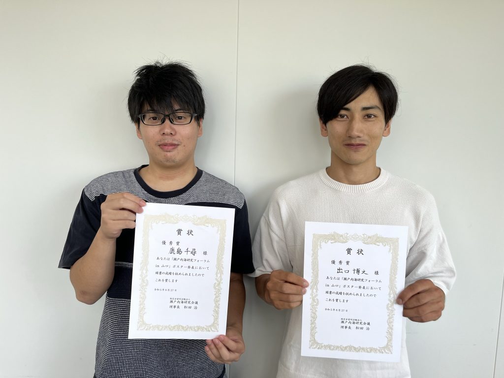 NEWS & TOPICS新着情報・お知らせ 一覧へ 2023-08-28 みず工学 鹿島千尋君,出口博之君が2023年度 瀬戸内海研究フォーラムで「優秀賞」を受賞 みず工学領域D2の鹿島千尋君とM2の出口博之君が,2023年度 瀬戸内海研究フォーラムin山口で優秀賞を受賞しました.本賞は,フォーラムで行われた「瀬戸内海と周辺海域の環境・経済・社会に関する研究・活動報告」において,優秀なポスター発表を行った学生または40歳未満の発表者に対して授与されるものです. 鹿島君は「地形改変が瀬戸内海の流動に及ぼす影響の数値解析」,出口君は「流動-水質-波浪カップリングモデルを用いた底層DOに及ぼす波浪の影響解析」に関する発表がそれぞれ評価され,本賞を受賞しました. 前の記事へ 次の記事へ