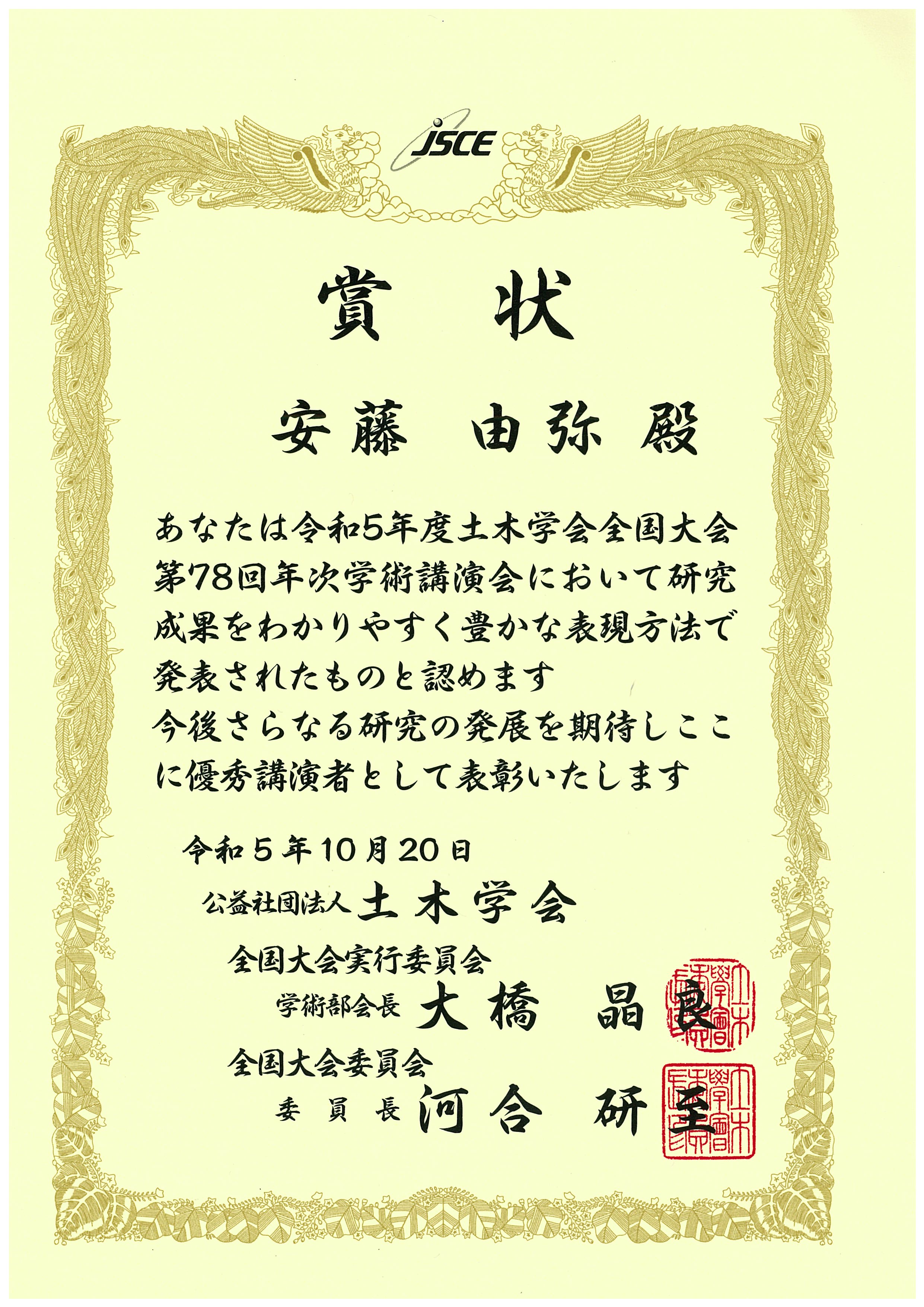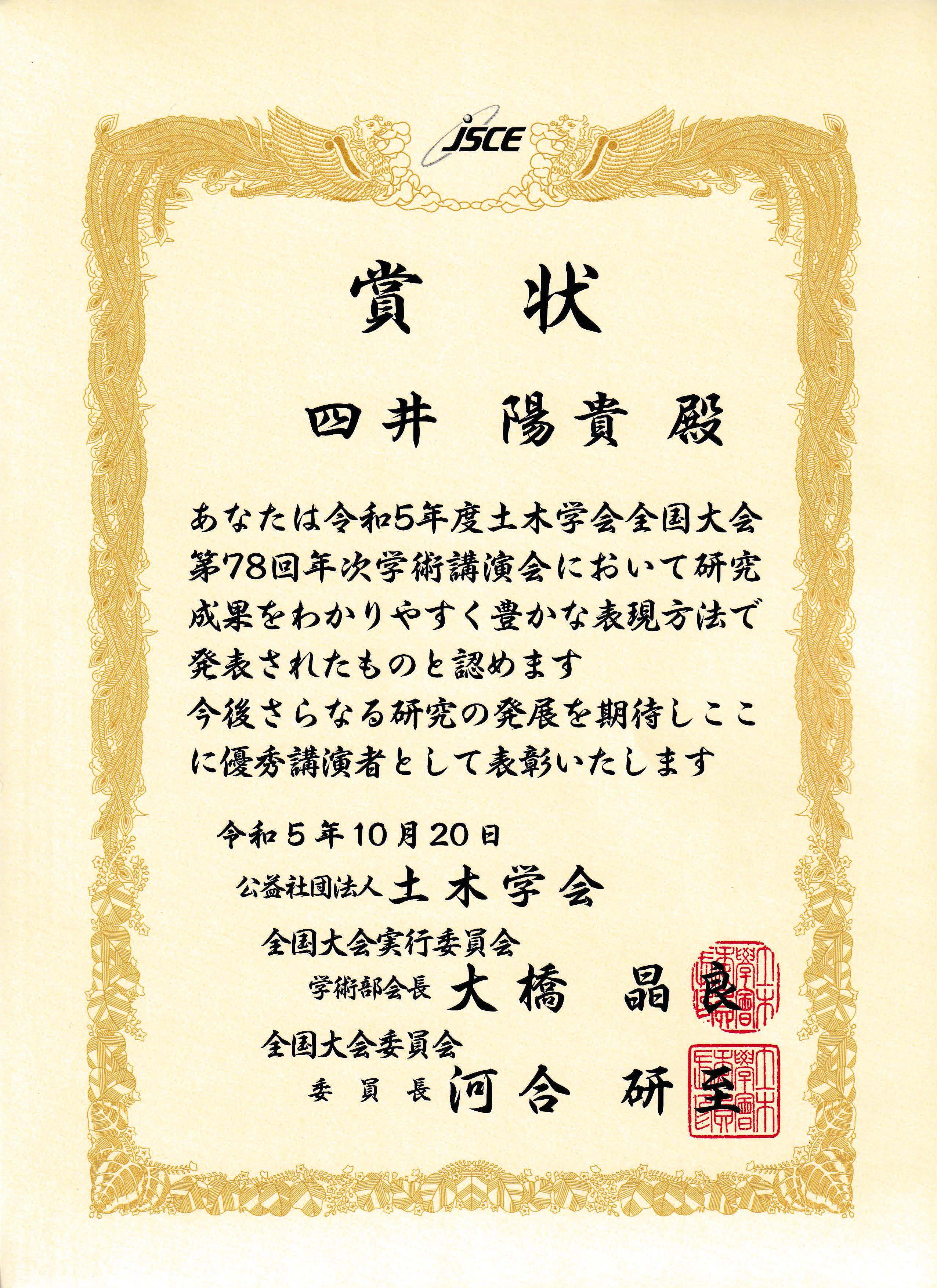 NEWS & TOPICS新着情報・お知らせ 一覧へ 2023-12-22 社基マネジメント 四井陽貴さんと安藤由弥さんが土木学会全国大会第78回年次学術講演会で優秀講演者賞を受賞 社会基盤マネジメント学領域のM2四井陽貴さんとM1安藤由弥さんが令和5年度土木学会全国大会第78回年次学術講演会において優秀講演者賞を受賞しました。 四井さんは講演題目「加速度データを用いた構造モデル更新における2段階MCMC法による極値分布の評価」、安藤さんは講演題目「統計的劣化予測に基づくトンネル補修優先順位の提案」という題目の論文発表が評価され、本賞を受賞しました。 前の記事へ 次の記事へ