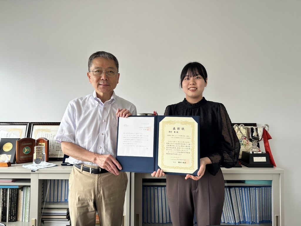 NEWS & TOPICS新着情報・お知らせ 一覧へ 2024-06-19 社会基盤設計 井村舞さんが日本材料学会第73期(令和6年度)学術講演会で優秀講演発表賞を受賞 地球総合工学専攻の博士前期課程学生の井村舞さん(M1)が、日本材料学会第73期(令和6年度)学術講演会で優秀講演発表賞を受賞しました。 本賞は、同大会において優れた研究発表を行った満35歳未満の発表者(登壇者)に授与されるものです。井村さんは研究論文「鉄筋によるノイズの影響を考慮した電磁パルス法による実構造物でのPCグラウト充填評価」が評価され、本賞を受賞しました。 前の記事へ 次の記事へ