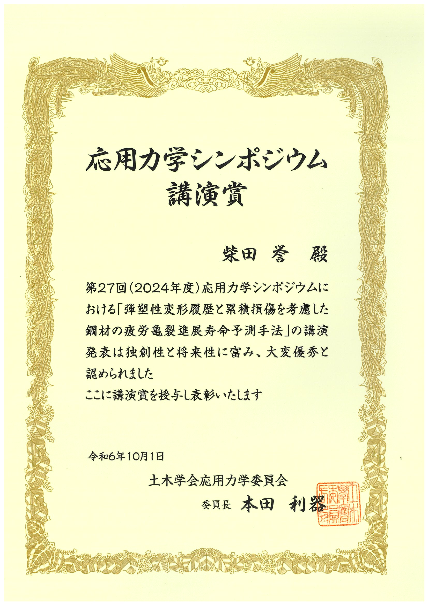 NEWS & TOPICS新着情報・お知らせ 一覧へ 2025-02-4 社会基盤設計 柴田誉さん(社会基盤設計学領域)が第27回応用力学シンポジウムで応用力学シンポジウム講演賞を受賞 地球総合工学専攻の博士前期課程学生(社会基盤設計学領域)の柴田誉さん(博士後期課程)が、第27回応用力学シンポジウムにて応用力学シンポジウム講演賞を受賞しました。 「弾塑性変形履歴と累積損傷を考慮した鋼材の疲労亀裂進展寿命予測手法」という題目の論文発表が評価され、本賞を受賞しました。 前の記事へ 次の記事へ