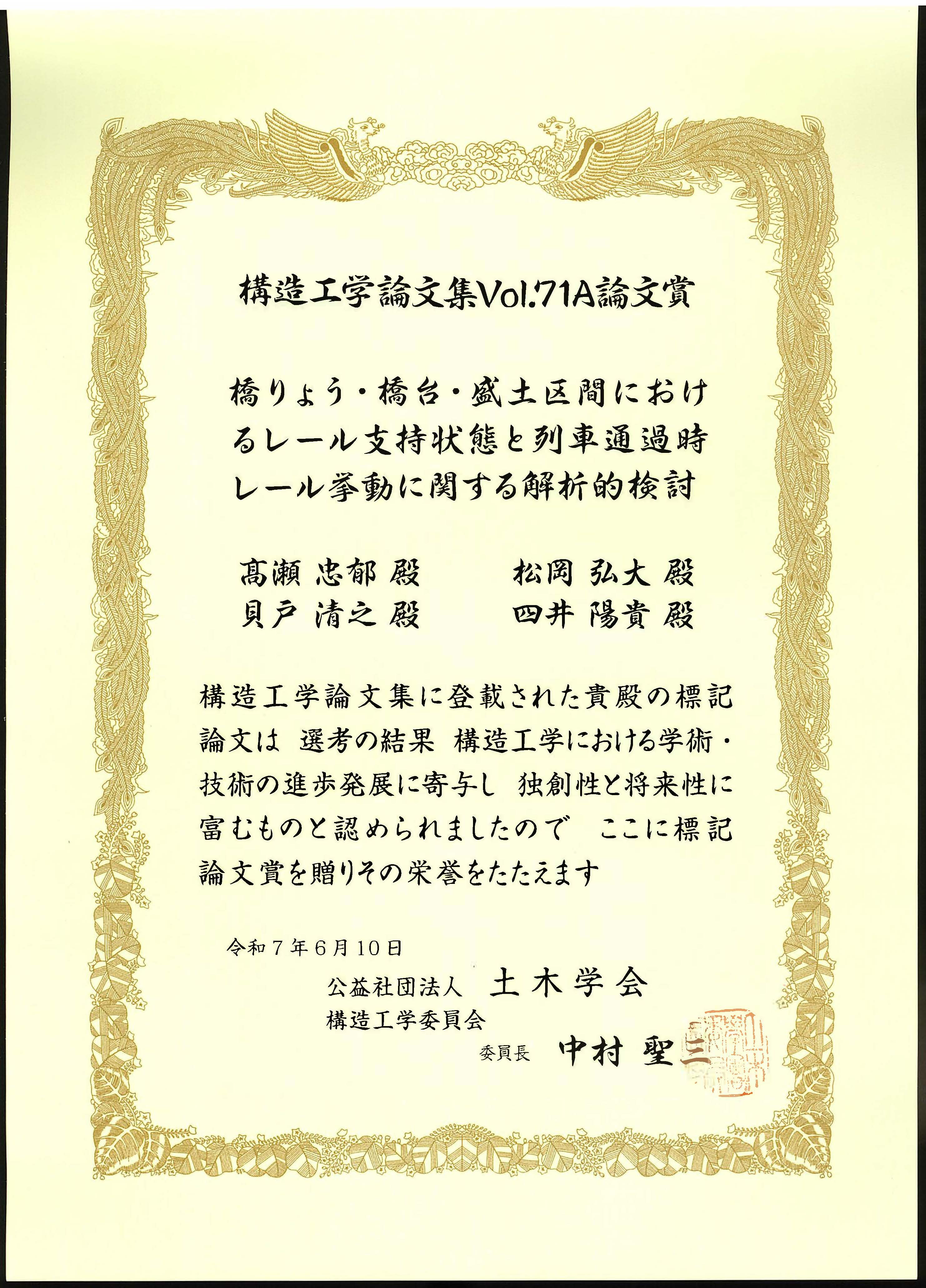 NEWS & TOPICS新着情報・お知らせ 一覧へ 2025-06-11 社基マネジメント 貝戸教授と髙瀬忠郁さん、松岡弘大さん、四井陽貴さんが構造工学論文集Vol.71A論文賞を受賞 地球総合工学専攻 社会基盤マネジメント学領域の貝戸教授と髙瀬忠郁さん、松岡弘大さん、四井陽貴さんが、構造工学論文集Vol.71A論文賞を受賞しました。 「橋りょう・橋台・盛土区間におけるレール支持状態と列車通過時レール挙動に関する解析的検討」という題目の論文発表が評価され、本賞を受賞しました。 前の記事へ 次の記事へ
