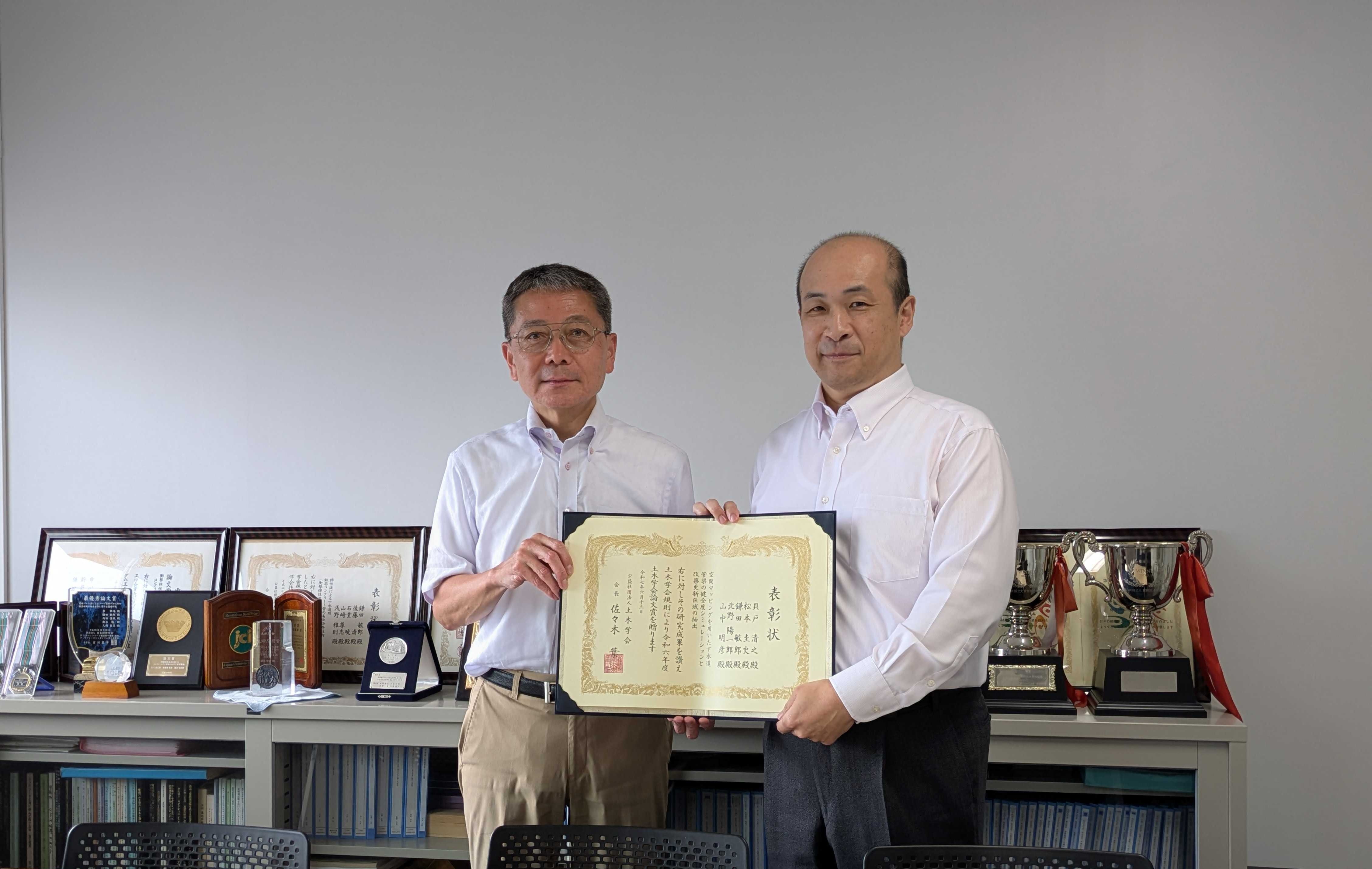 NEWS & TOPICS新着情報・お知らせ 一覧へ 2025-06-16 社基マネジメント 貝戸教授が令和6年度土木学会論文賞を受賞 貝戸清之教授、松本圭史さん、鎌田敏郎教授、北野陽一郎さん、山中明彦さん(賞状掲載順)が令和6年度 土木学会論文賞を受賞しました。「空間マッピングを用いた下水道管渠の健全度シミュレーションと改築更新区域の抽出」という題目の論文発表が評価され、本賞を受賞しました。 前の記事へ 次の記事へ