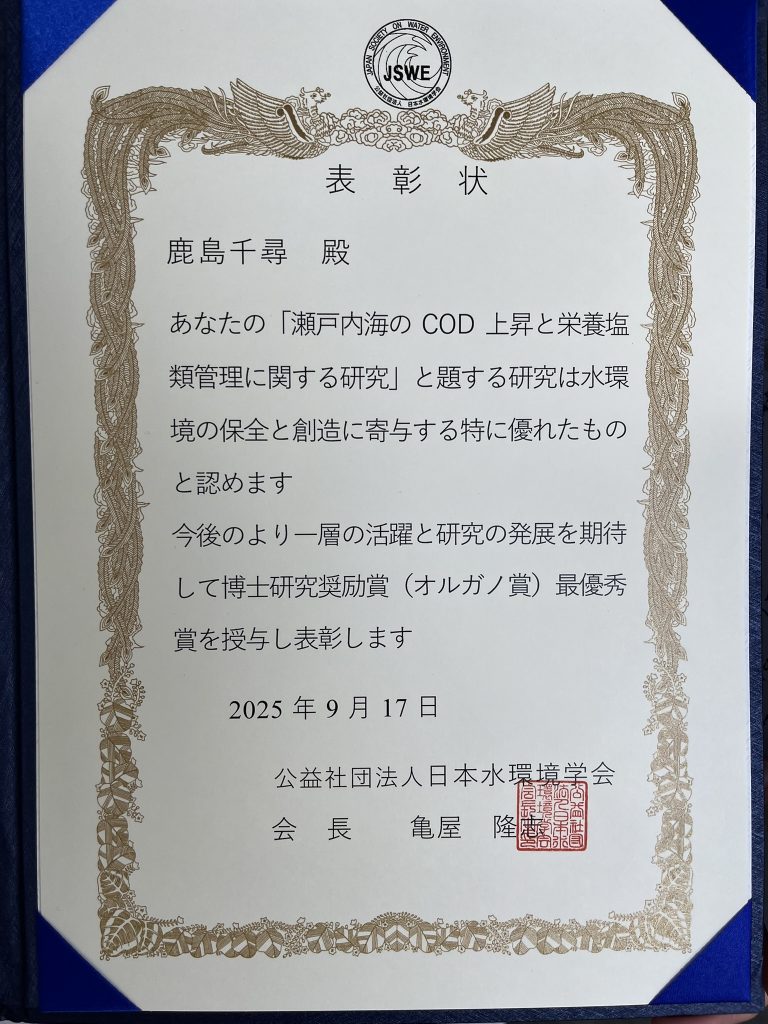 みず工学領域の特任研究員である鹿島千尋さんが,第28回日本水環境学会シンポジウムで博士研究奨励賞(オルガノ賞)最優秀賞を受賞しました.