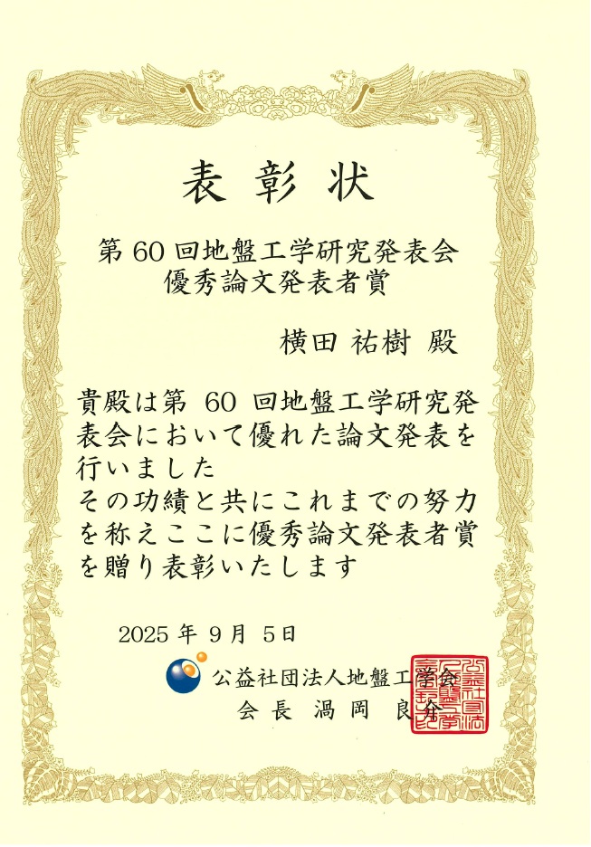 NEWS & TOPICS新着情報・お知らせ 一覧へ 2025-11-19 社基マネジメント 横田祐樹さんが第60回地盤工学研究発表会で優秀論文発表者賞を受賞 2025地盤工学_表彰状地球総合工学専攻博士前期課程の横田祐樹さんが、第60回地盤工学研究発表会で優秀論文発表者賞を受賞しました。本賞は優秀な発表を行った35歳以下の若手研究者に対して授与されるもので、横田さんは下記の研究発表が評価され、受賞に至りました。「素因・誘因の影響を考慮した深層学習による斜⾯崩壊箇所予測モデルの構築」 前の記事へ 次の記事へ