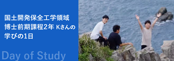 大学院生の日常生活は学部生とは異なったものとなります。学部生は講義がメインですが、大学院生は研究がメインとなり、研究室内ゼミ、他の研究室との合同ゼミや学会などで発表する機会が多くあります。そのため、自分の考えを他人に理解してもらえるように論理立てて説明する能力を養うことができます。また実験や現地観測は一人ではなくグループとして行うことが多いのでチームワークが大切になります。このように大学院では論理的思考力やチームワークのような実践的なスキルを鍛える貴重な経験ができます。また、研究室では約20名が日々共に過ごしており、研究のことからささいなことまで何でも話し合える良い雰囲気であり、研究をするときは研究をする、休む時は休む、とメリハリをつけた生活を心がけています。