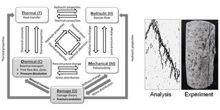 高レベル放射性廃棄物や二酸化炭素を長期にわたり深地層下の岩盤内に貯留するためには、岩盤内の温度、水の流れ、応力・損傷、化学反応等が絡み合う連成現象に伴う岩盤の力学・水理学特性変化の予測評価が必須です。この複雑な連成現象を紐解く数理モデル・シミュレータを新たに開発し、様々な実問題に適用します。